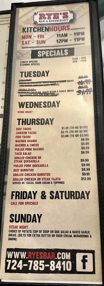 Rye's offers a diverse menu featuring grilled favorites and comfort food. From burgers and sandwiches to hearty soups, each dish brings a taste of tradition. Local specialties make each visit memorable.